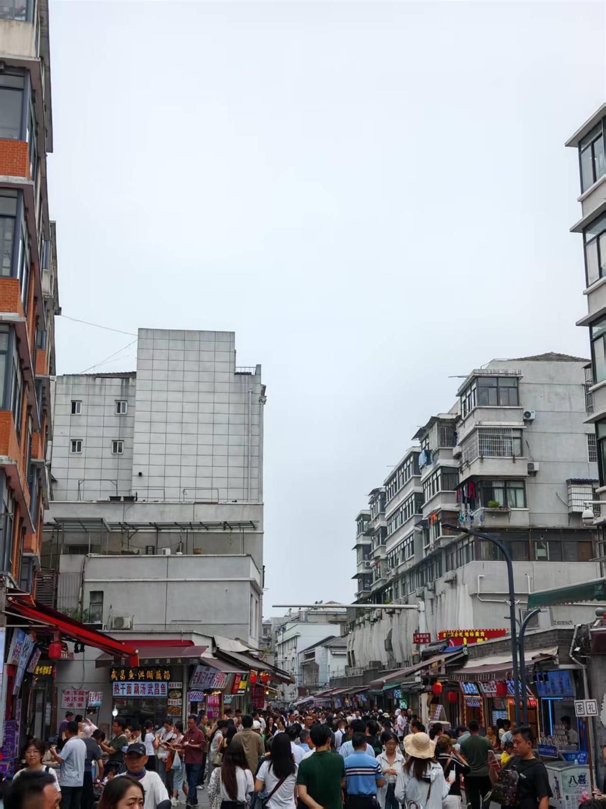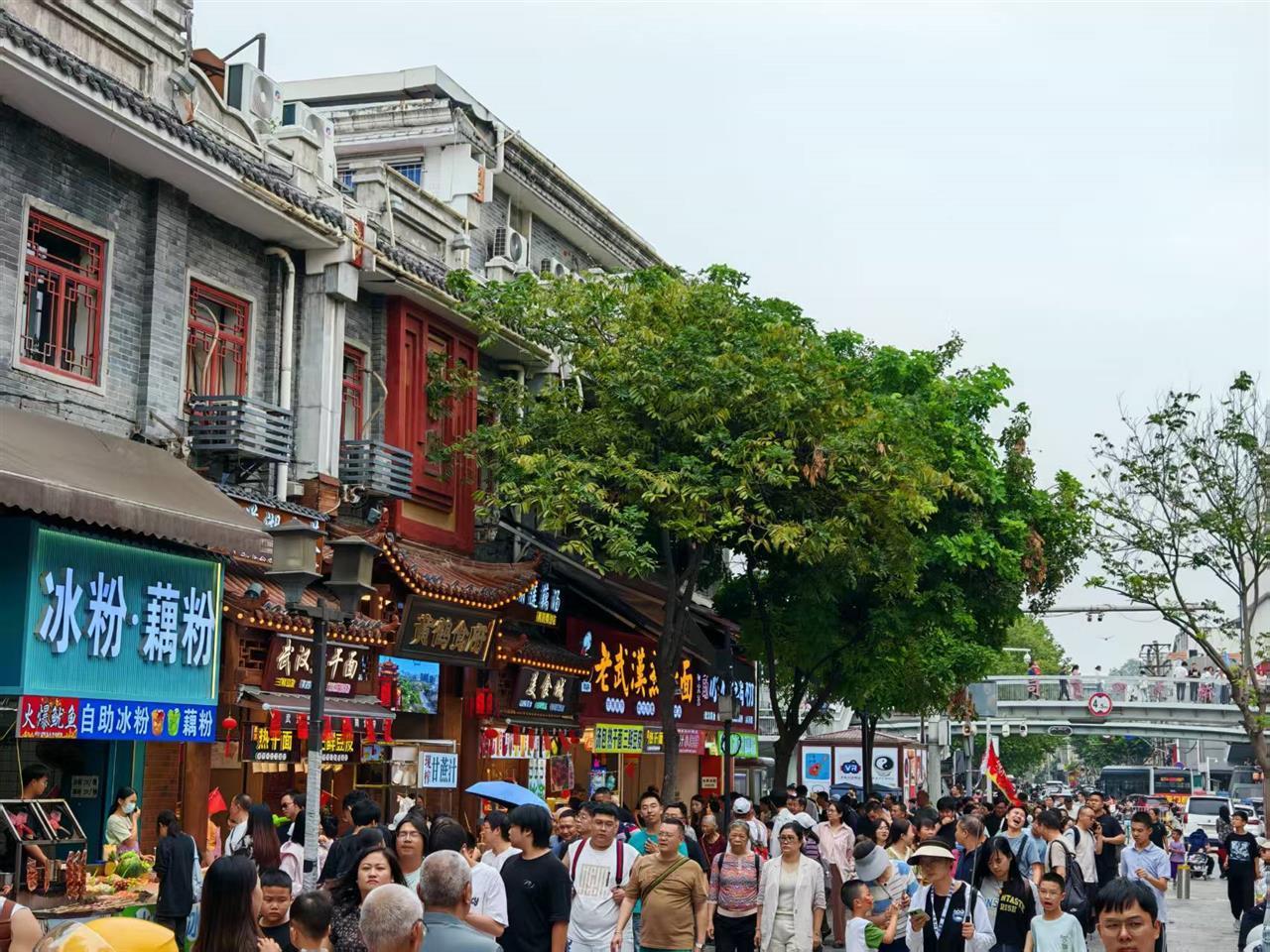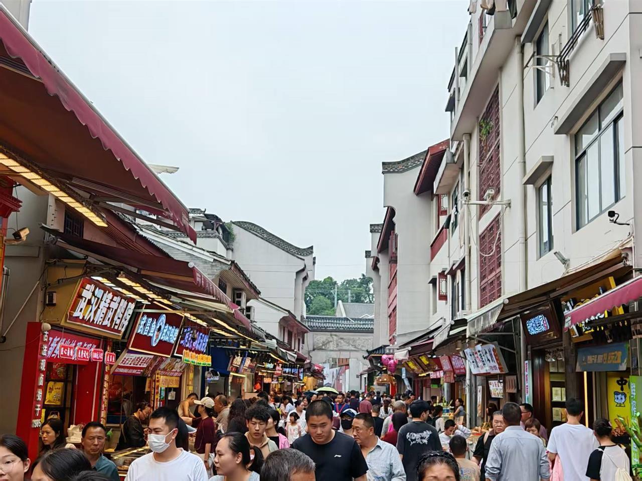 青灰砖墙与红檐商铺错落交织,“武汉精武鸭脖”“三鲜豆皮”“冰粉・藕粉”等招牌在街巷间流光溢彩,不少门店前都排着长队。