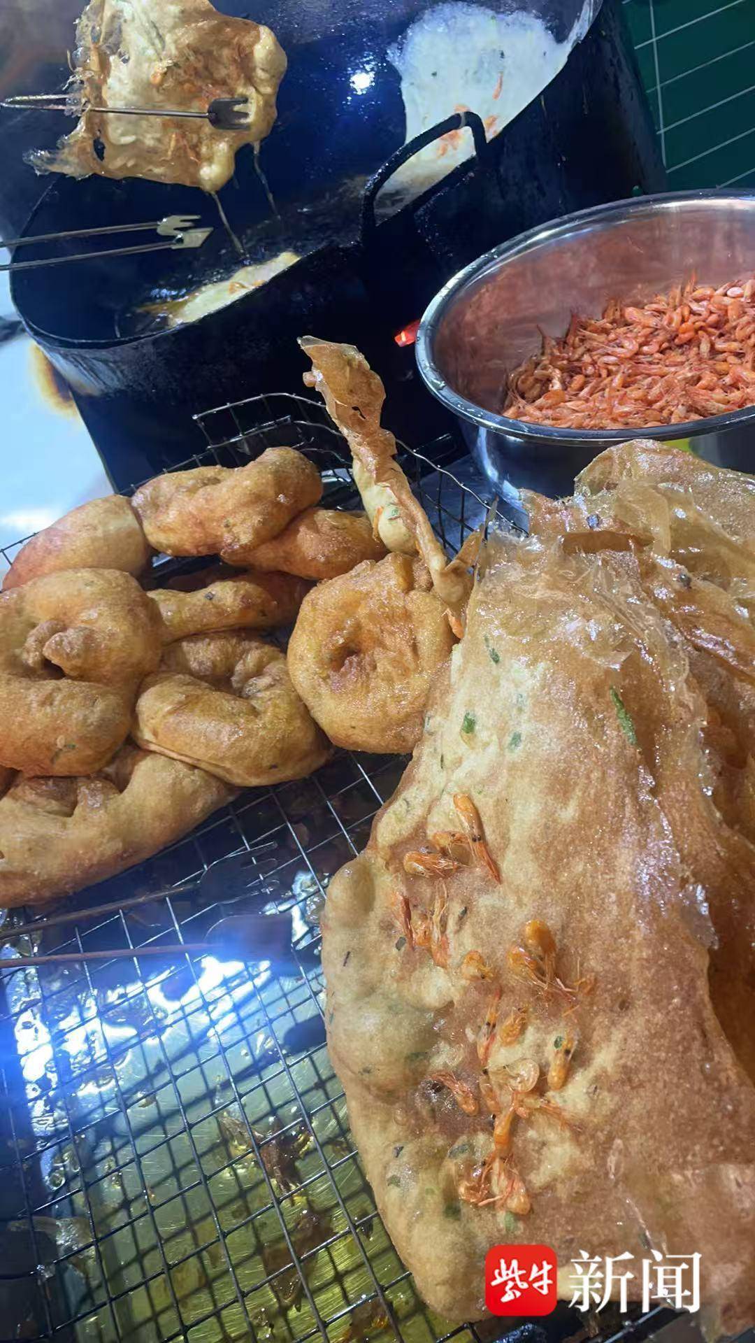 这些宝藏小城的吃食除了蟹黄包子价格比较高之外,其他的都很平价,比如如皋还有个“排队王”小吃虾糍和油墩子,一位住在附近的居民告诉记者,这里“几乎就没有不排队的时候”,虾糍实际上是发面泼在油锅边上,形成薄如扇面的一层,再扔上去几颗小河虾,最后在油锅里炸得金黄酥脆出锅,而油墩子就是直接发面团进锅里油炸,虽然热量很高但是当地人从小吃到大的美食,现在因为屡次被社交平台大V晒视频,开店的老夫妻俩基本上是从开门忙到打烊,门外面排的队伍就没有缩短过。